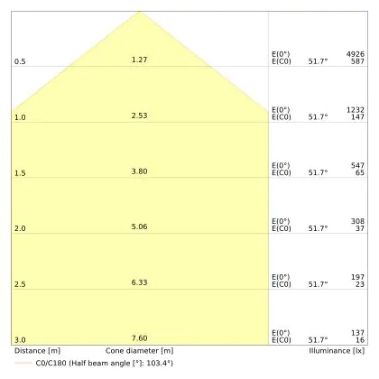 De gradenbundel geeft informatie over hoe breed het licht wordt uitgestraald. Dit zit tussen de 0 en 360 graden (D). Hoe kleiner de hoek, hoe specifieker de lichtbundel is. Over het algemeen is een smalle gradenbundel perfect voor sfeer- of accentverlichting, terwijl een brede gradenbundel ideaal is om grote oppervlaktes te verlichten.