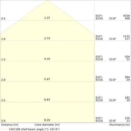 De gradenbundel geeft informatie over hoe breed het licht wordt uitgestraald. Dit zit tussen de 0 en 360 graden (D). Hoe kleiner de hoek, hoe specifieker de lichtbundel is. Over het algemeen is een smalle gradenbundel perfect voor sfeer- of accentverlichting, terwijl een brede gradenbundel ideaal is om grote oppervlaktes te verlichten.