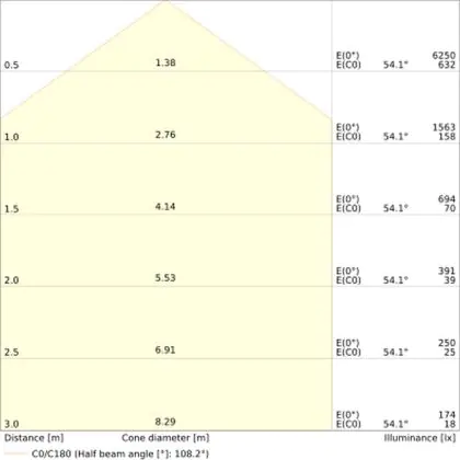 De lichtopbrengst (Lumen), geeft weer hoe krachtig het uitgestraalde licht is. Dit is belangrijk om te weten om de juiste sfeer te creëren. 0 tot 400 Lumen is bij uitstek geschikt voor accent- of sfeerverlichting. Een hoger aantal Lumen is, afhankelijk van de grootte van de ruimte, beter geschikt als ondersteunende- of basisverlichting. Heb je plafonds hoger dan 4 meter, dan is een lichtopbrengst van minimaal 8000lm aan te raden indien heldere verliching gewenst is (vb. in werkomgevingen).