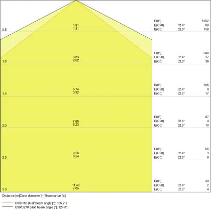 De lichtopbrengst (Lumen), geeft weer hoe krachtig het uitgestraalde licht is. Dit is belangrijk om te weten om de juiste sfeer te creëren. 0 tot 400 Lumen is bij uitstek geschikt voor accent- of sfeerverlichting. Een hoger aantal Lumen is, afhankelijk van de grootte van de ruimte, beter geschikt als ondersteunende- of basisverlichting. Heb je plafonds hoger dan 4 meter, dan is een lichtopbrengst van minimaal 8000lm aan te raden indien heldere verliching gewenst is (vb. in werkomgevingen).
