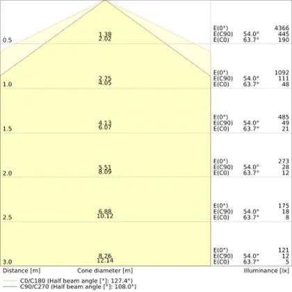 De lichtopbrengst (Lumen), geeft weer hoe krachtig het uitgestraalde licht is. Dit is belangrijk om te weten om de juiste sfeer te creëren. 0 tot 400 Lumen is bij uitstek geschikt voor accent- of sfeerverlichting. Een hoger aantal Lumen is, afhankelijk van de grootte van de ruimte, beter geschikt als ondersteunende- of basisverlichting. Heb je plafonds hoger dan 4 meter, dan is een lichtopbrengst van minimaal 8000lm aan te raden indien heldere verliching gewenst is (vb. in werkomgevingen).