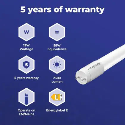 Deze Noxion LED TL buis heeft een Lumen / Watt efficiëntie van lm/W. Dit is de waarde die je verkrijgt door de lichtopbrengst (2300 Lumen) te delen door het wattage (19W) van deze lichtbron. Hoe weet je of jouw lichtbron een goede efficiëntie heeft? In dit geval ligt de lm/W waarde boven de 65. Je kunt er ook voor kiezen om een LED geïntegreerd TL armatuur te kopen. Hierbij heb je de keuze uit diverse (waterdichte) LED montagebalken, die in een divers aantal Lumen verkrijgbaar zijn. Een (dimbaar) LED paneel is ook een slimme optie, met name voor ruimtes met een systeemplafond (eenvoudige installatie) en kantoren (UGR<19 varianten).